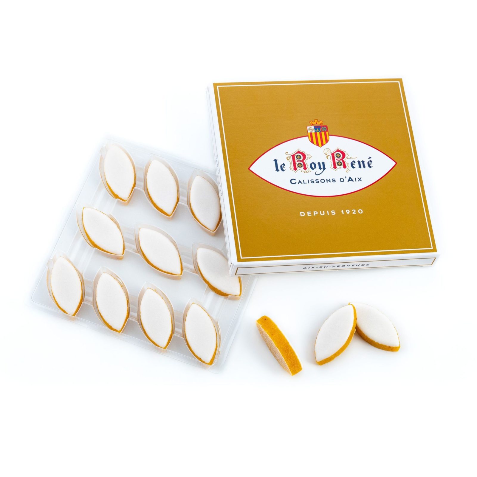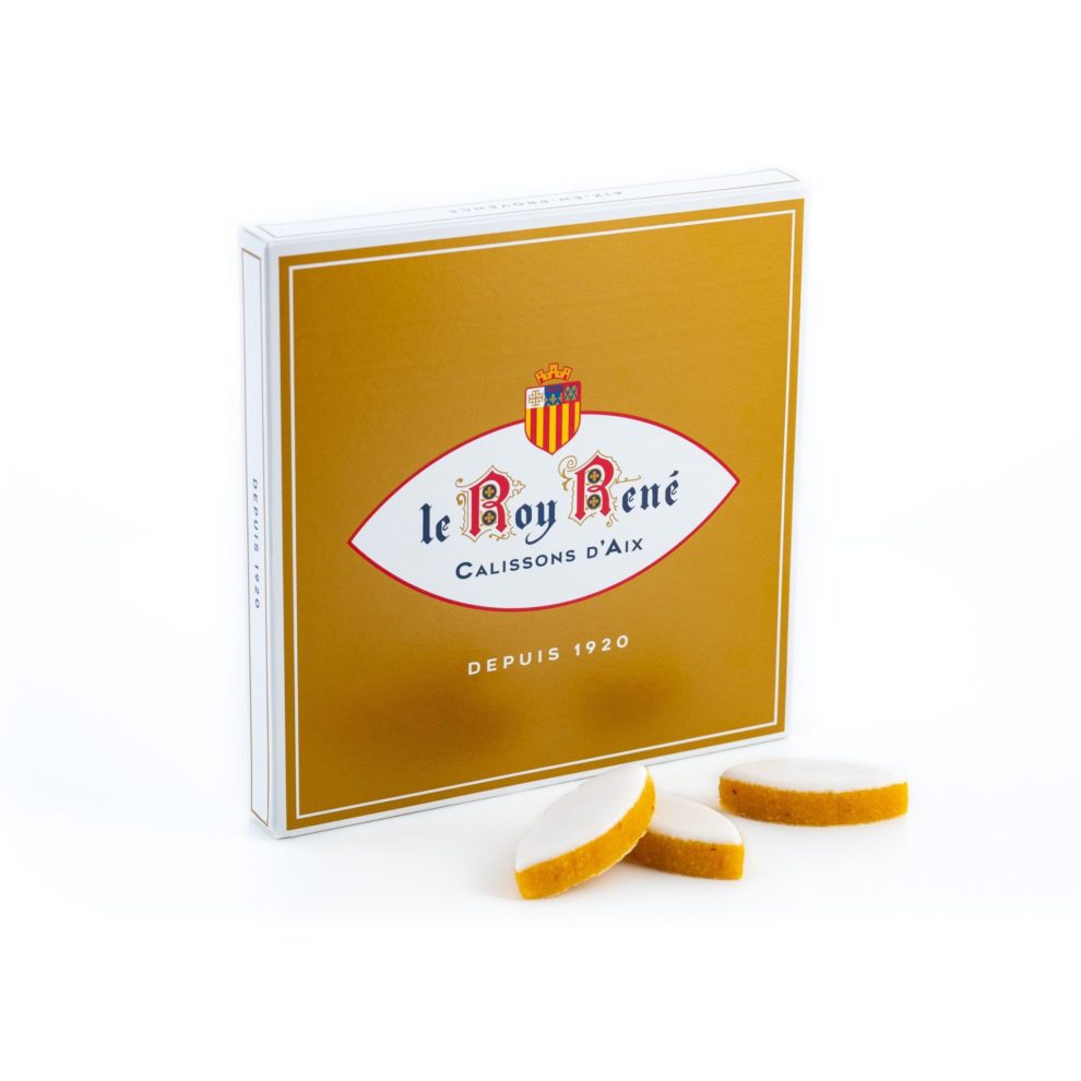 Succombez au charme du coffret de 11 calissons Roy René où la tradition du calisson d’Aix est restée inchangée depuis sa création : mélange d’amandes douces finement broyées, de melon confit provençal et d’écorces d’orange, le tout dressé sur un lit d’hostie, recouvert d’un écrin de glace royale.