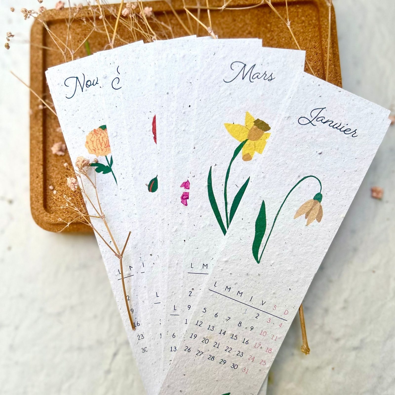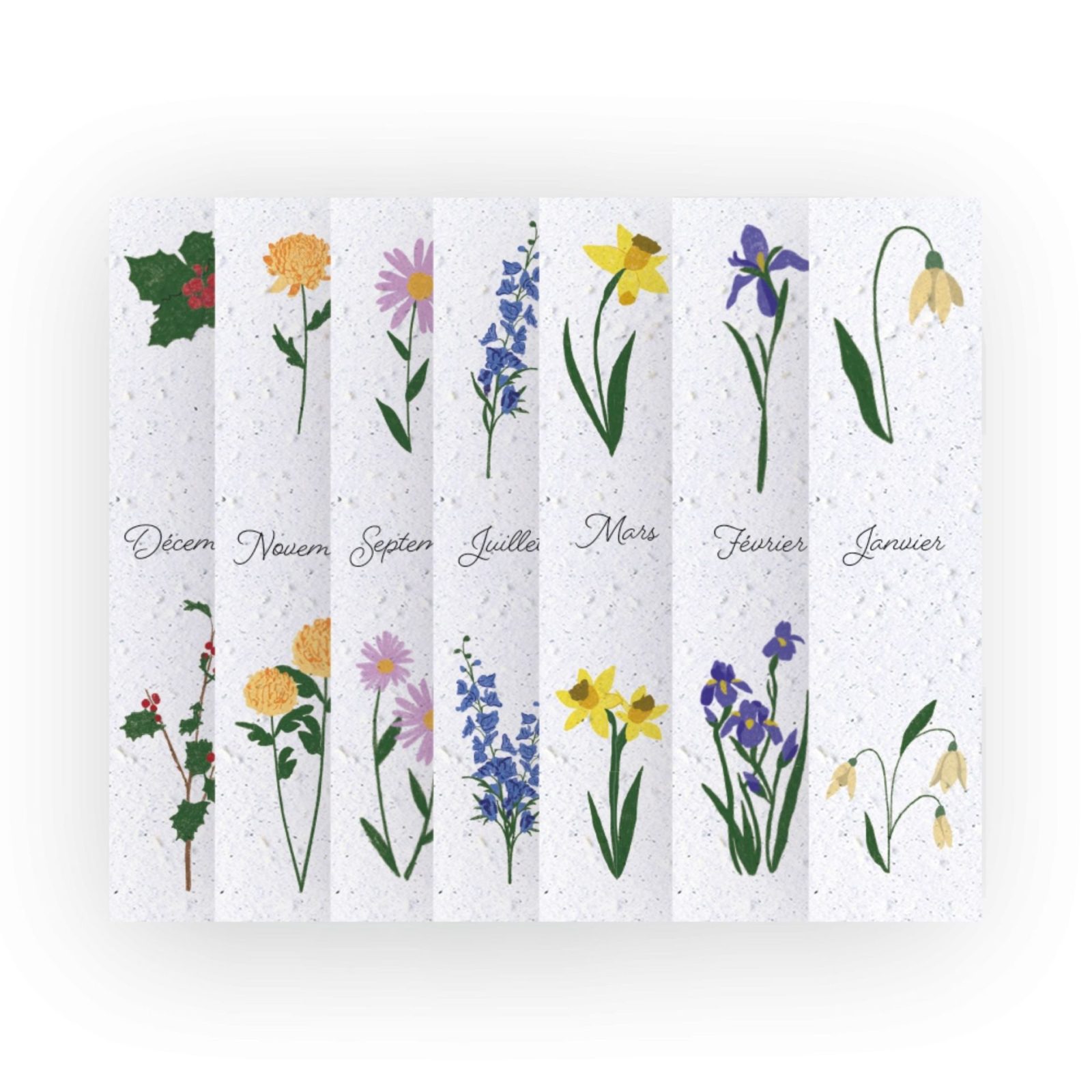 Découvrez nos marque-pages à planter mettant en lumière les fleurs de naissance ! 12 marque-pages calendriers artistiquement illustrés, chacun représentant la fleur associée à chaque mois de naissance, en papier à planter ensemencé de graines de fleurs des champs. Les 12 mois de l’année en fleurs !