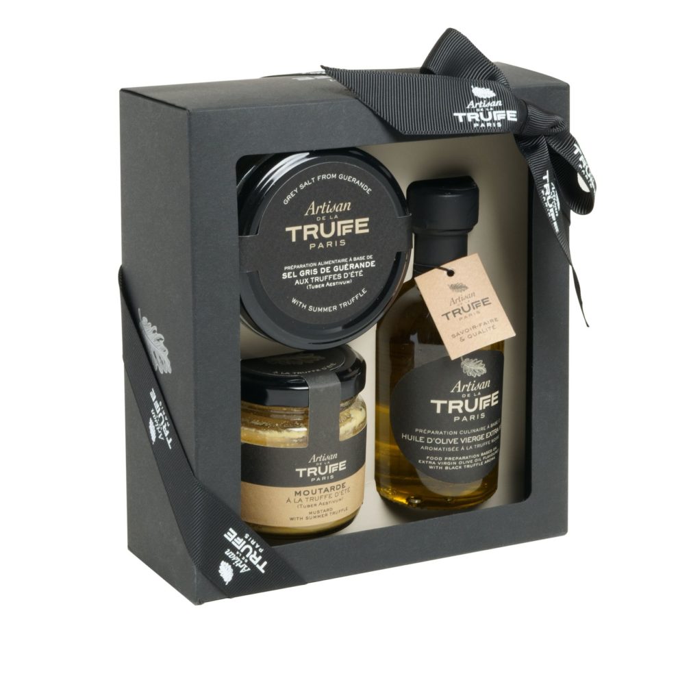 Un coffret réunissant une huile d’olive vierge extra saveur truffe noire, un sel de Guérande IGP à la truffe d’été et une moutarde à la truffe d’été. Le cadeau idéal pour les fins gourmets !