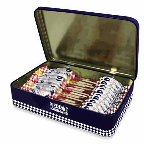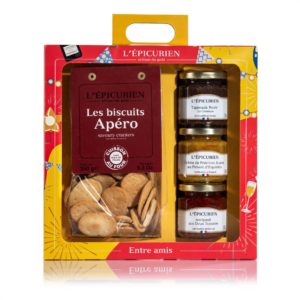 Composition du coffret : une crème de poivrons jaunes au piment d’Espelette (100g), une tapenade classique (100g), un antipasti aux deux tomates (100g) et un paquet de biscuits salés sans huile de palme (150g).
