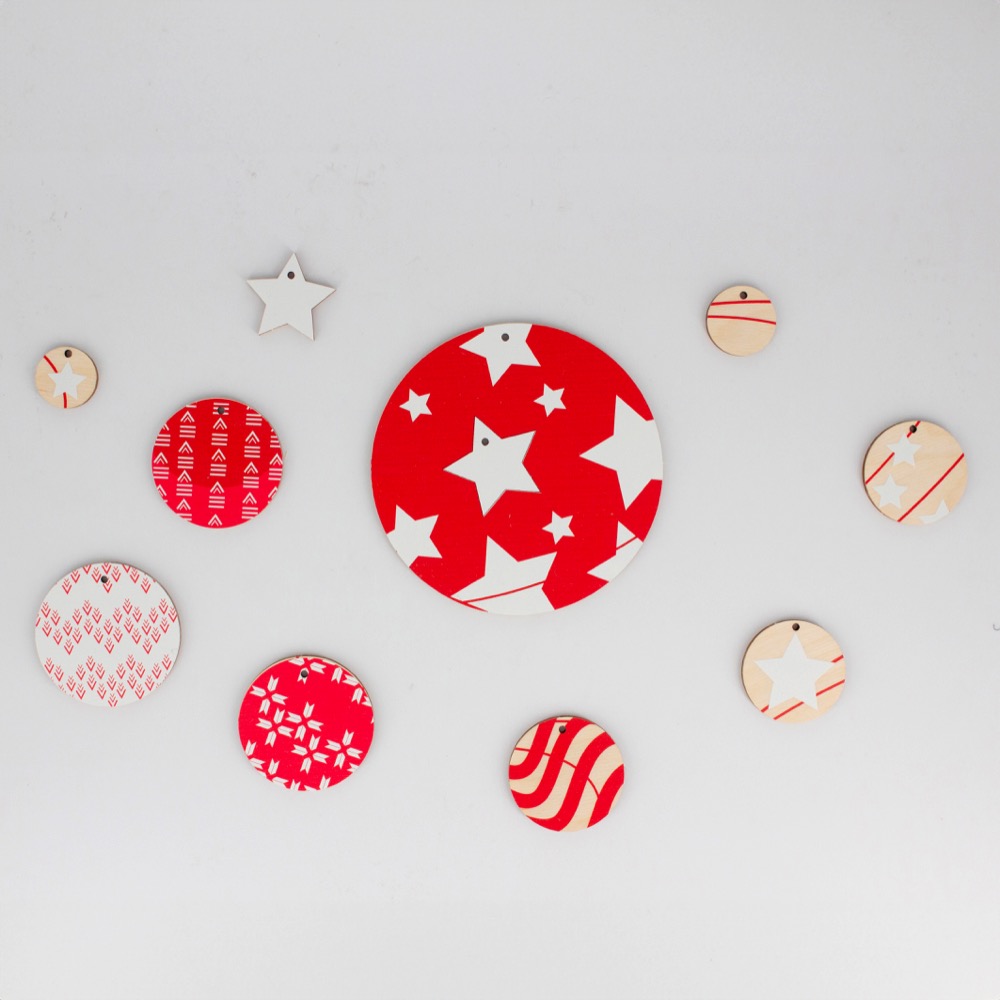10 décorations en bois (bouleau) à accrocher.