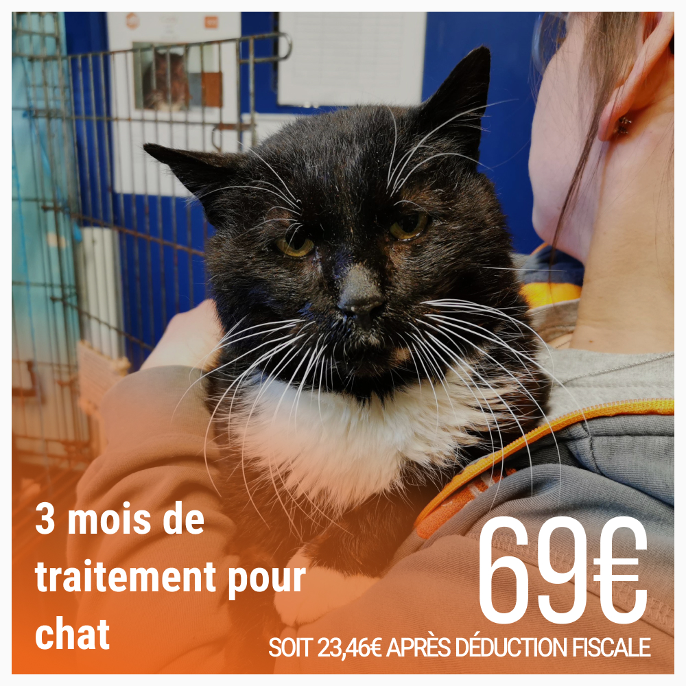 Avec un don de 69 € soit 23,46 € après déduction fiscale, vous pouvez aider en urgence au traitement des chats comme Cody. Votre générosité fera toute la différence.