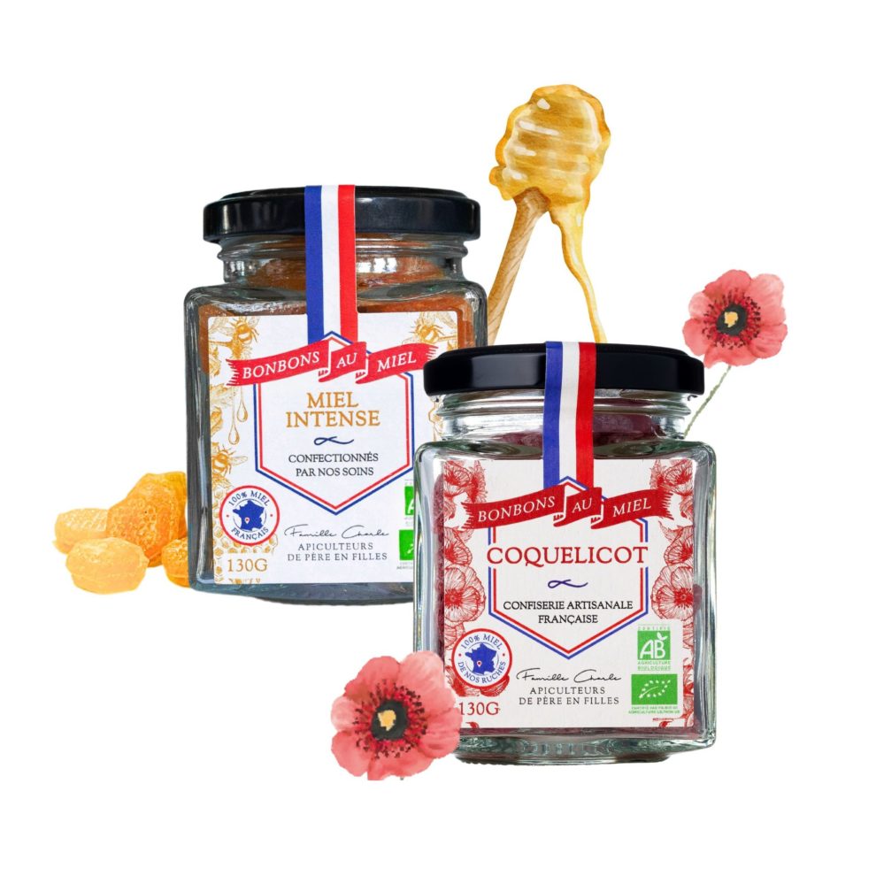 Régalez-vous avec les bonbons gourmands au bon goût de miel de l’entreprise familiale « Les abeilles de Malescot ». Chacune de leurs recettes de bonbons contient 20% du bon miel de nectar bio soigneusement récolté dans le Lot-et-Garonne. Découvrez notre sélection de deux parfums : miel intense et coquelicot.