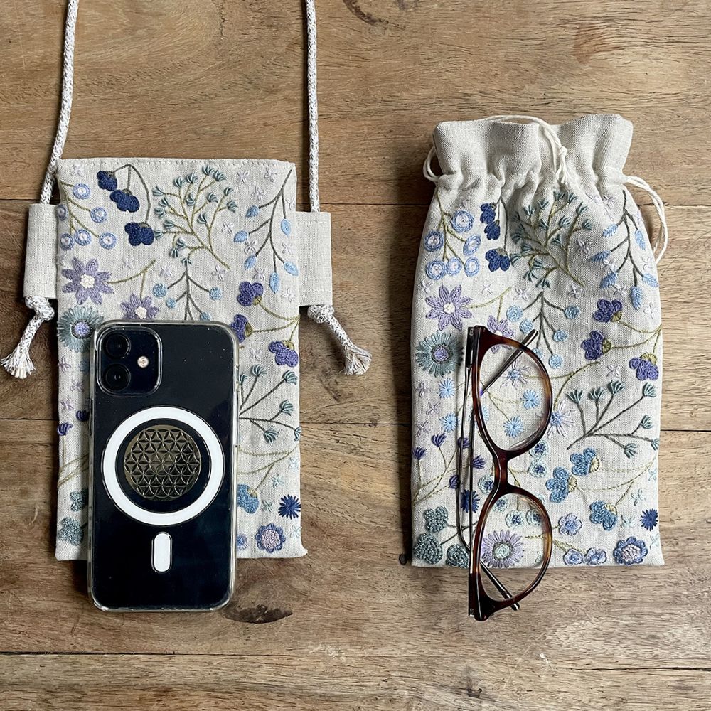 Vous trouverez dans ce kit, tout le nécessaire pour réaliser soit un étui à lunettes, soit une pochette pour téléphone portable. Seul le recto de la pochette est brodé.