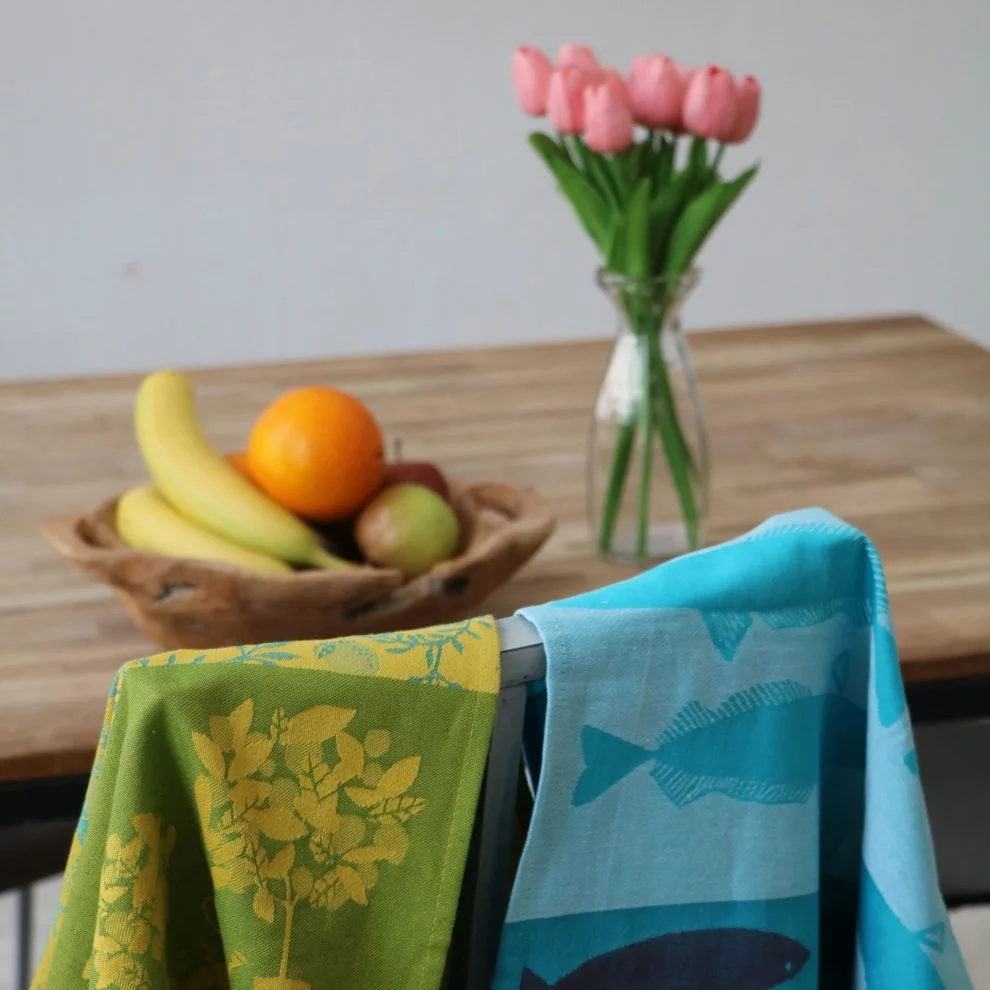 Apportez de la fraîcheur et de l’originalité à votre cuisine avec ce lot de deux torchons tissés à la main à Orthez. Le modèle « Citrons verts » et « Poissons » de Tissage Moutet ajoutent une touche colorée et vitaminée à votre intérieur.