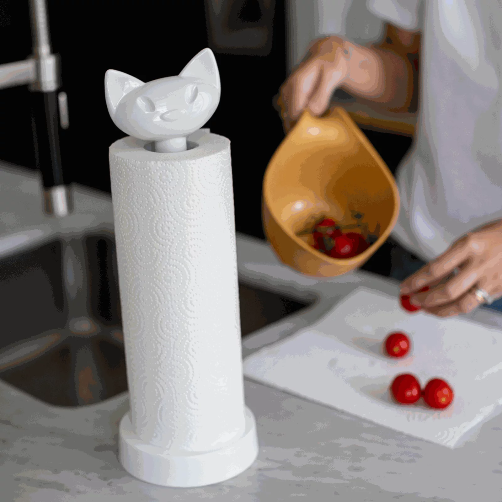 Depuis son point d’observation parfait, MIAOU surveille son territoire pour protéger votre cuisine des éclaboussures et des débordements, tout en maintenant vos rouleaux de papier essuie-tout fins et élégants, laissant ainsi plus d’espace pour votre créativité culinaire. Sa tête se détache facilement pour les recharges, mais elle ne reste jamais perdue très longtemps. Solidement installée sur sa large base, cette astucieuse petite chatte reste à la fois stable et stylée, même lors des repas les plus animés en famille