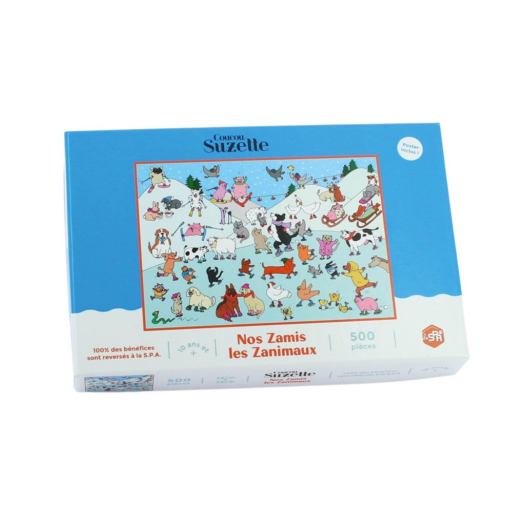 Une journée à la patinoire avec nos Zamis les chiens, les chats, les vaches, les poules… Tous très fiers de leurs magnifiques figures en patins à glace ! À vous de jouer et de rassembler les 500 pièces de ce puzzle aussi coloré que drôle. Une façon originale de soutenir les actions de notre association !