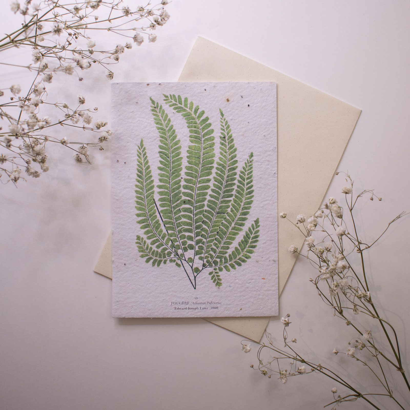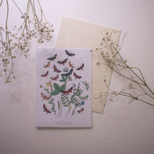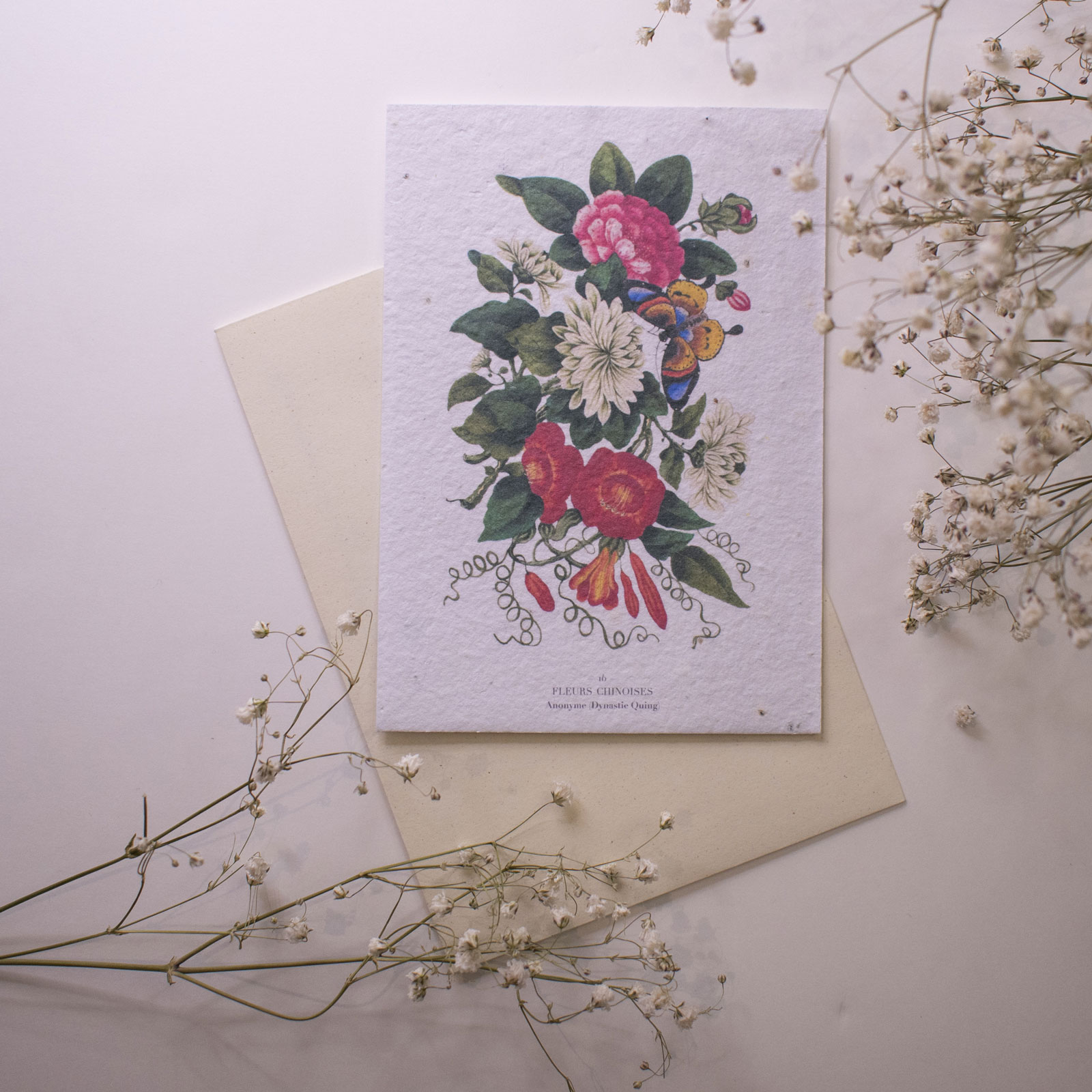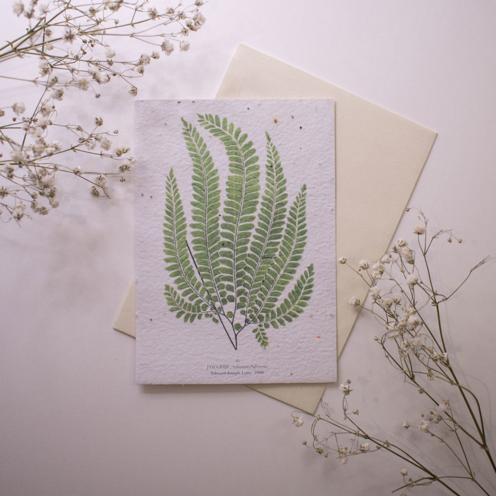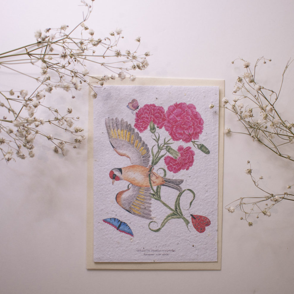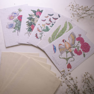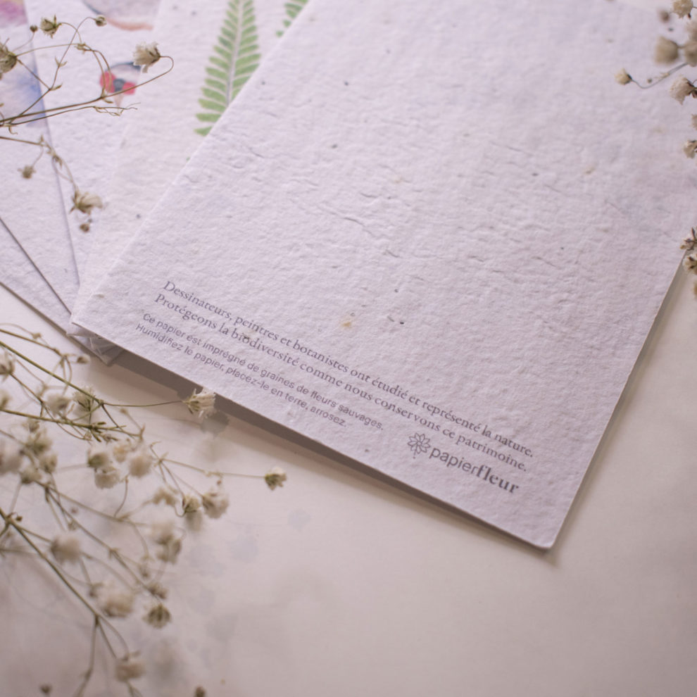 Papier : Ce lot de cartes et enveloppe est imprimé sur du papier ensemencé. Ce papier, biodégradable et compostable, est fabriqué à partir de fibres recyclées. Il est serti de graines et peut être planté. À toutes les étapes de la fabrication nous faisons en sorte que soient préservés les qualités germinatoires et le caractère éco-responsable de nos produits.